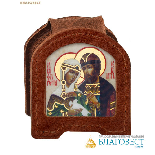 Икона дорожная раскладная «Святые благоверные Петр и Феврония Муромские». Цвет коньяк. Обложка изготавливается из натуральных сортов кожи и имеет удобную складывающуюся конструкцию, которая надежно обеспечивает сохранность размещенных в ней изображений во время транспортировки. Дополнительной особенностью такой конструкции является наличие в ней универсальной кнопки-застежки, которая в случае обратного перестегивания хлястика, позволяет удерживать установленную на стол открытую икону в устойчивом вертикальном положении.Встраиваемые в обложку иконы и тексты молитв имеют прочную ламинированную поверхность. Применяемая при их изготовлении технология печати, позволяет создавать яркие и красочные изображения. В качестве дополнительного украшения, соответствующие фрагменты рисунков покрыты золотистой фольгой.